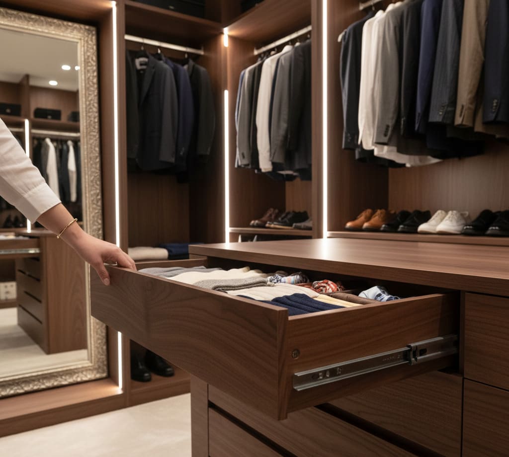 Dans un dressing de luxe, chaque détail compte : matériaux, éclairage, agencement, et surtout les solutions de rangement. Les tiroirs amortis apportent une sensation de raffinement au quotidien. Ils ferment en silence, évitent les chocs et préservent les vêtements fragiles. Au-delà de l’aspect esthétique, ils participent à la longévité du mobilier en limitant l’usure des façades et des coulisses.